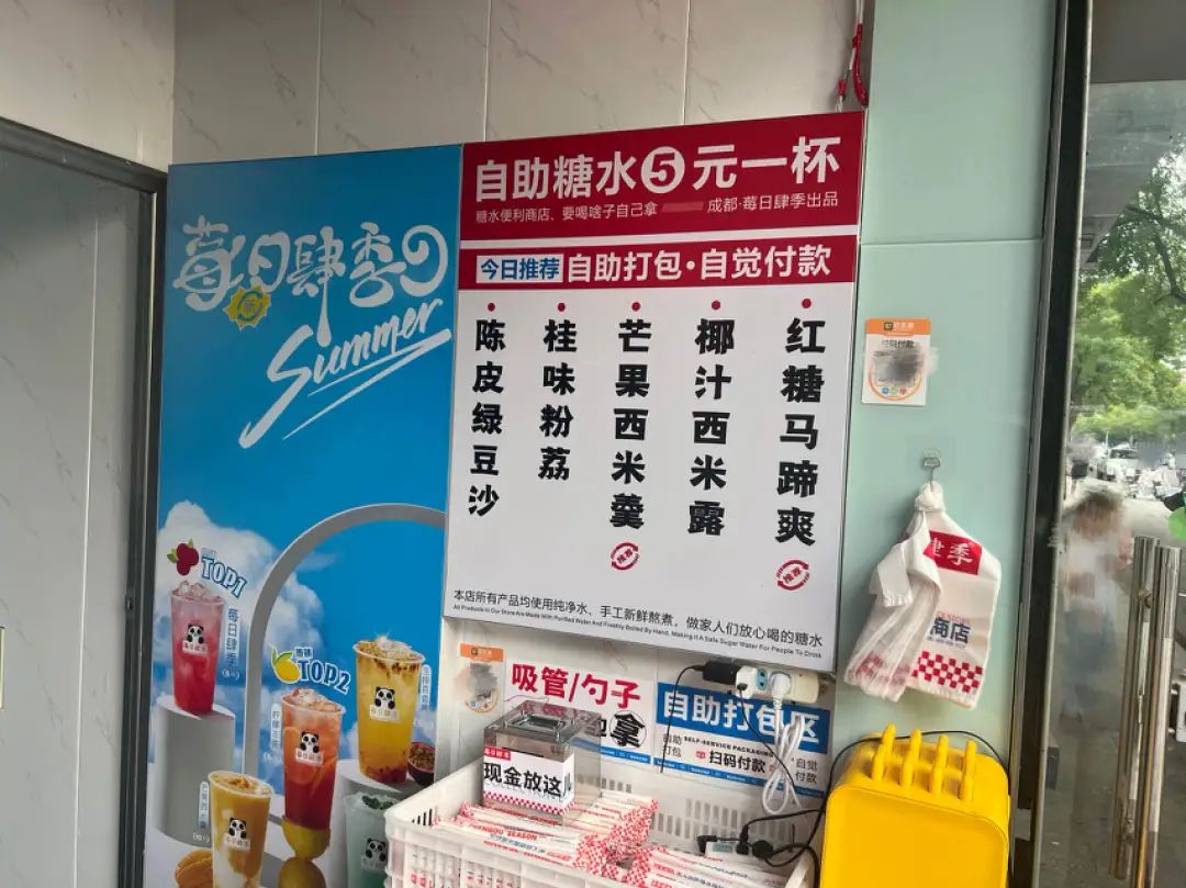 售价在5-6元一杯,路过、好奇的消费者都不介意来上一杯。“低价+糖水+自助”的概念,纯靠自觉买单的体验,给消费者带来不少新鲜感。