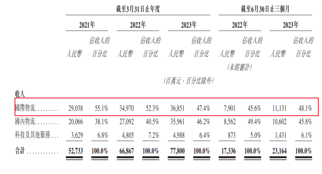 实际上,菜鸟国际市场的收入占比整体呈现下滑趋势。招股书显示,2021财年-2024财年一季度,国际物流收入占比分别为55.1%、52.3%、47.4%、48.1%。