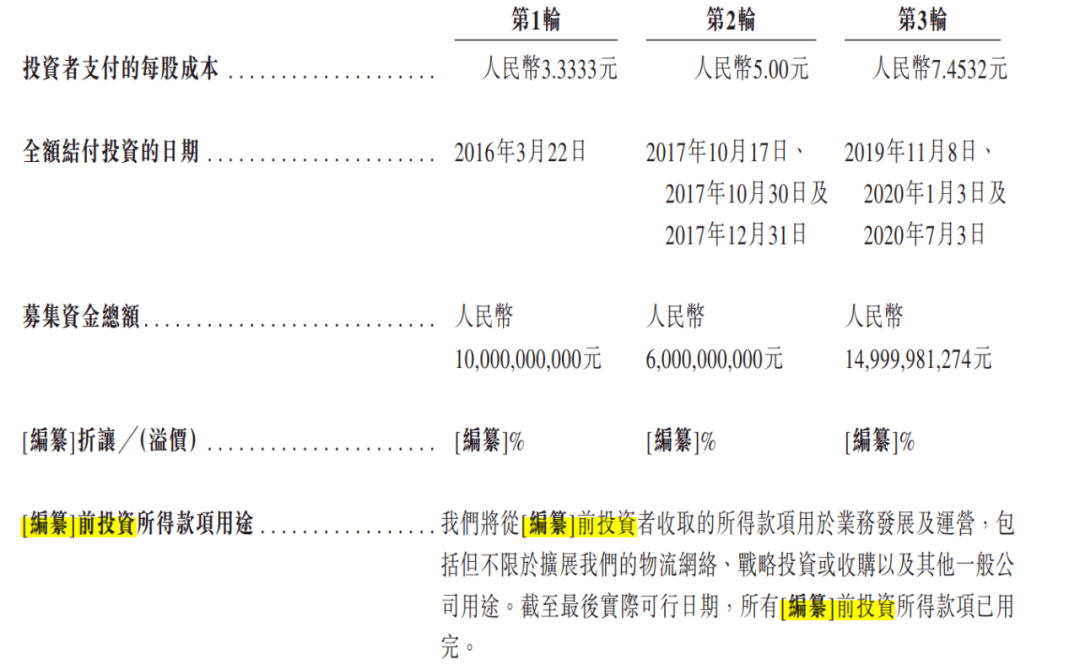 招股书显示,菜鸟分别于2016年、2017年、2019年进行了三轮融资,融资额分别为100亿元、60亿元、149.9998亿元。