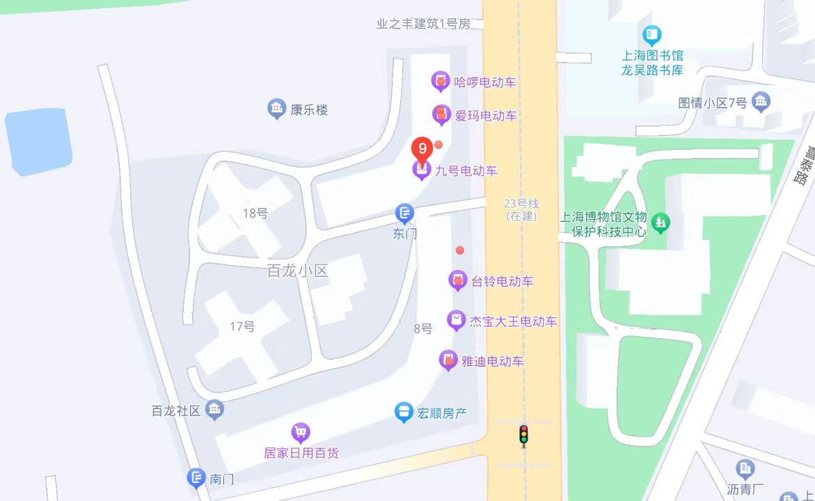 以惊蛰研究所所在的上海市徐汇区为例,在百度地图搜索“电动车”可以得到96个相关结果,而徐汇区54.93平方公里的面积内仅有12个街道1个镇。在位于龙吴路的百龙小区东门不到200米的路边,更是盘踞了包括雅迪、爱玛、九号、台铃、哈啰在内的共计10家电动车品牌门店。
