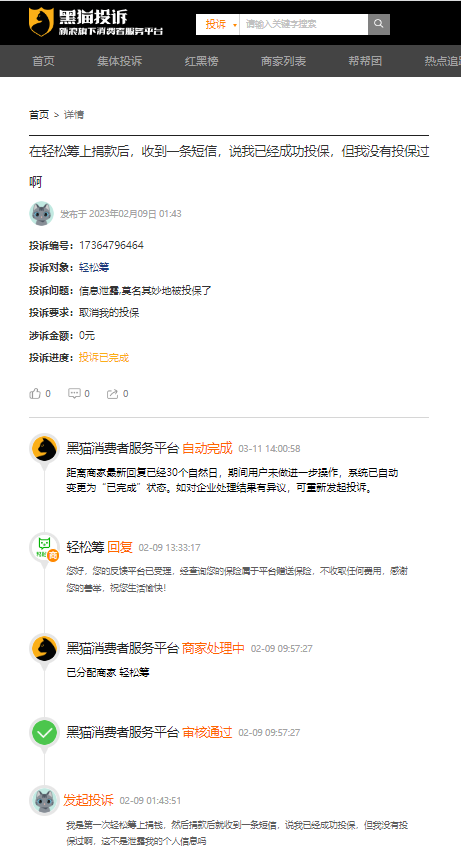 黑猫消费者平台上关于轻松筹的投诉众多,比如2月的一条投诉中,用户表示:我是第一次轻松筹上捐钱,然后捐款后就收到一条短信,说我已经成功投保,但我没有投保过啊,这不是泄露我的个人信息吗!