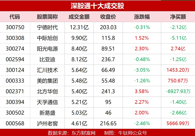 深股通成交额最高的个股为宁德时代,成交额达12.31亿元,净卖出2.12亿元,收盘跌0.31%。其次是中际旭创,成交额为9.90亿元,净卖出5.11亿元,收涨1.52%。阳光电源成交额8.40亿元,净买入2.74亿元,收盘涨2.30%。