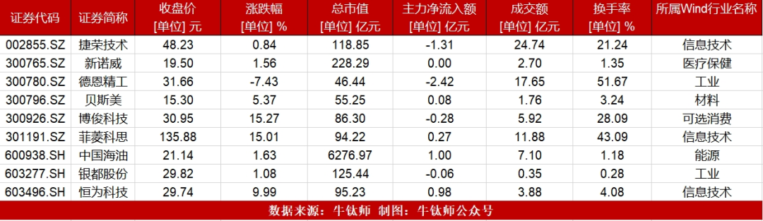 资金流向上,今日创新高股主力资金合计净流出1.74亿元。主力资金净流入的有4只,为贝斯美、菲菱科思、中国海油和恒为科技,净流入资金分别为0.08亿元、0.27亿元、1亿元和0.98亿元。