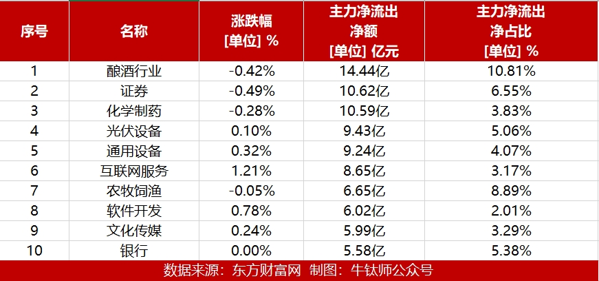 主力资金净流出前十板块中酿酒行业、证券和化学制药板块流出金额最多,分别为14.44亿元、10.62亿元和10.59亿元,此外光伏设备、通用设备、互联网服务、农牧渔饲、软件开发、文化传媒和银行板块同样资金流出规模居前。
