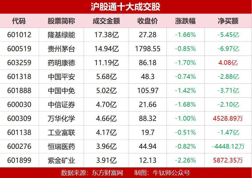 个股方面,沪股通成交额最高的个股为隆基绿能,成交额达17.38亿元,净卖出5.45亿元,收盘跌1.66%。其次是贵州茅台,成交额为14.94亿元,净卖出6.97亿元,收盘跌0.85%。