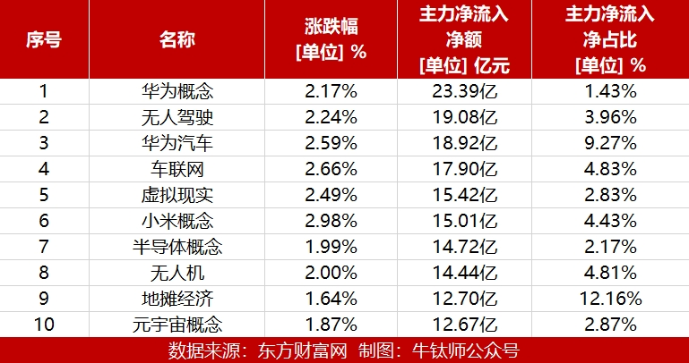 从概念板块来看:今日华为概念、无人驾驶和华为汽车板块主力资金流入较多,流入净额分别为23.39亿元、19.08亿元和18.92亿元,另外,车联网、虚拟现实、小米概念、半导体、无人机、地摊经济和元宇宙概念主力资金流入也靠前。