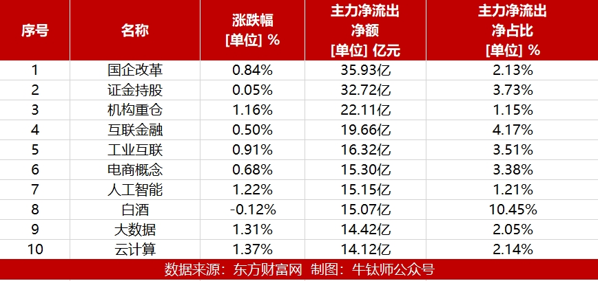 今日国企改革概念板块主力资金流出最多,流出净额达35.93亿元。紧随其后的是证金持股和机构重仓,流出净额为32.72亿元和22.11亿元。互联金融、工业互联、电商概念、人工智能、白酒、大数据和云计算也是主力资金流出较多的板块。