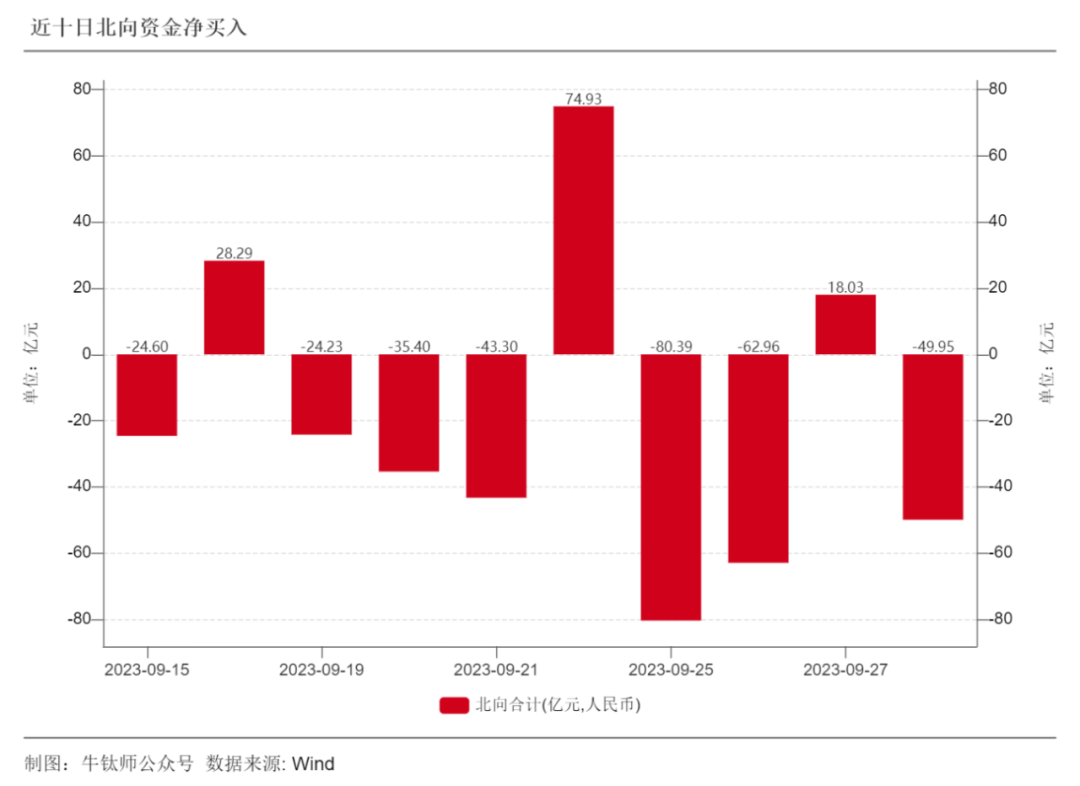 今日北向资金全天成交金额992.178亿元,占A股总成交额的13.8%。北向资金当日净卖出49.95亿元;其中,沪股通净卖出28.48亿元;深股通净卖出21.47亿元。据Wind数据,近十日,北向资金有七日为净卖出。
