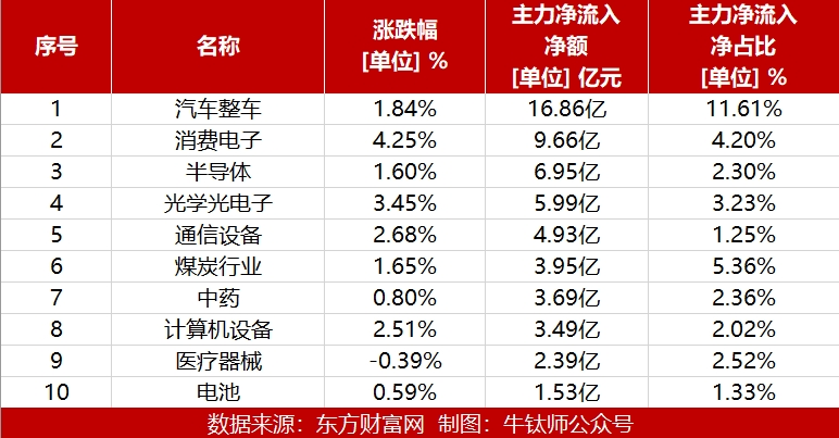 从行业板块来看:汽车整车流入规模最大,达16.86亿元,主力净流入净占比达到11.61%,其次是消费电子,主力净流入9.66亿,半导体主力净流入6.95亿,另外,光学光电子、通信设备、煤炭行业、中药和计算器设备板块主力净流入均超3亿元。