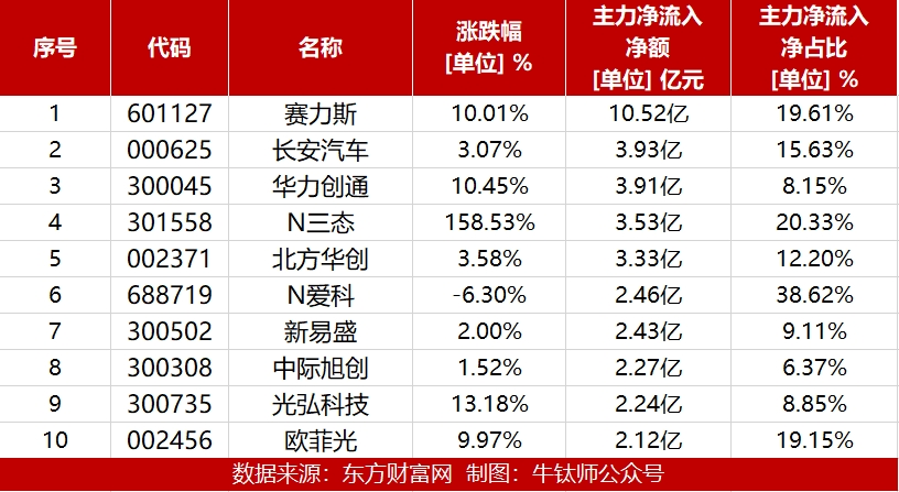 从个股来看,今日有1985个股获主力资金净流入,其中,35只个股获主力资金净流入超1亿元。其中,赛力斯获主力资金净流入最多,净流入金额为10.52亿元。