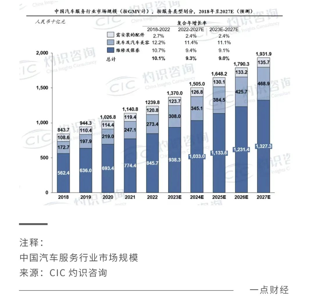 在此背景下,汽车后市场也在持续增长。根据灼识咨询报告,2022年,中国汽车服务市场(包含汽车维修及保养、汽车清洁及汽车美容以及需安装配件)规模已达人民币1.2万亿元,预期2023-2027年将以9%的复合年增长率增长,2027年将达到1.9万亿元。