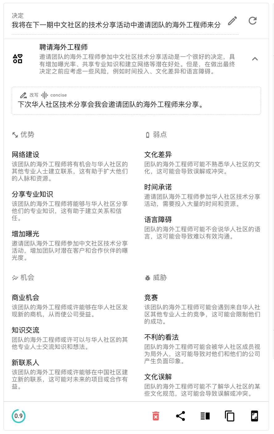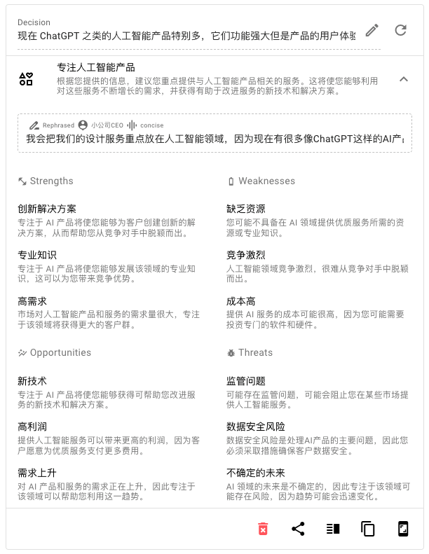 Rationale 是 Jina 最早推出的一款实验性 AI 生成产品。尽管它目前并非 Jina AI 主要研发的关注点,但它满足了用户对决策分析的需求,并发挥了 GPT 在生成决策分析方面的能力。这使得 Rationale 曾在日本引起了一些舆论浪潮。与 ChatGPT 提供泛泛的回答相比,Rationale 有着更具体的问题和回答模板。