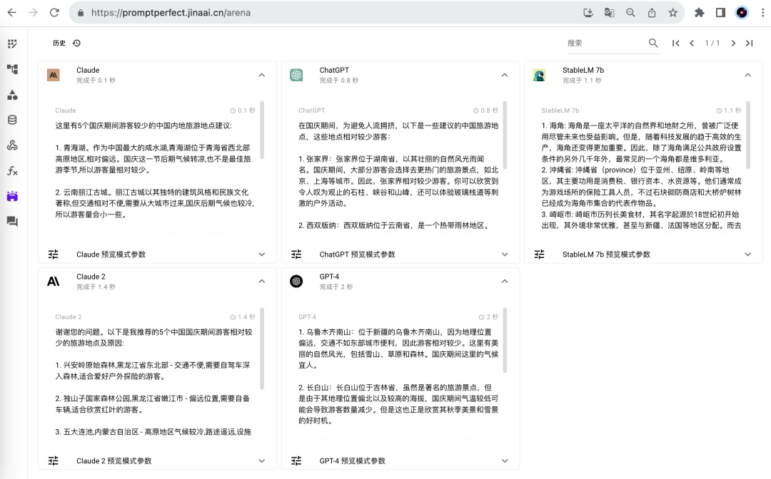 比如我们将上面优化好的提示词,放在竞技场里,让不同大模型来推荐国庆期间的旅游地点。