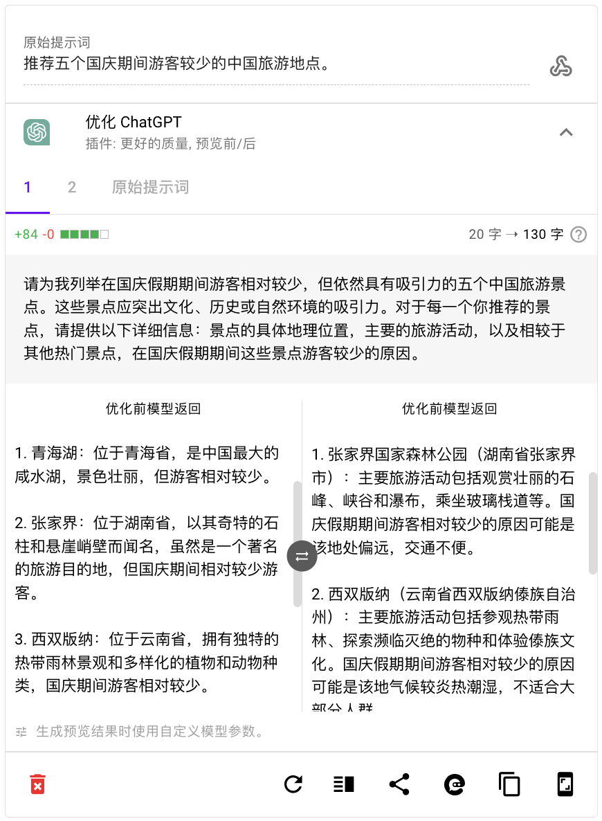 比如我希望得到 5 个国庆期间游客较少的中国旅游地点, 优化提示词之前,ChatGPT 返回的结果比较粗糙,没有多少有效信息。优化之后,通过把需求更加细化明确,设定了回答的格式和标准,大模型的回答也就更有用,更具洞察力了。