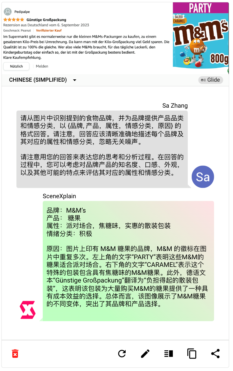 SceneXPlain 还具备多模态的视觉问答能力,能够抓取出图片中的信息,并结构化的输出。它还已经和一些消费型企业开启了合作,进行社交媒体内容分析。该工具可以做到批量地为社交网络的发帖标注图片内容,并提供进一步的见解分析,且准确度相当高。这可以用来进一步对内容做归档、检索和解析。对消费品来说,社交帖子可能反映出消费者当前的情绪,意向,或挖掘潜在的产品开发可能。