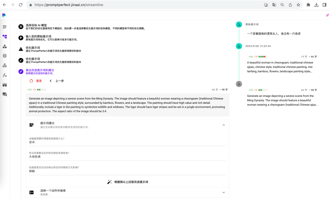 在一键优化提示词之上,PromptPerfect 也支持了逐步优化提示词的功能。当我想要绘制一幅“一个穿着旗袍的漂亮女人,身边有一只老虎”时,它会反问我,希望这幅画呈现的氛围,特定的色调,和是否需要反映特定的时期。并且将中文提示词自动优化成了适应于 Midjourney 的英文及格式。