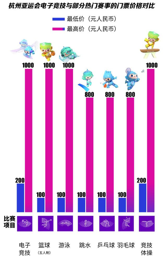 作为对比,杭州亚运会其他项目比赛门票价格则要低很多,有的比赛最低票价仅20元。在所有杭州亚运会的比赛项目中,60%以上的票价不超过100元,平均票价不超过160元。