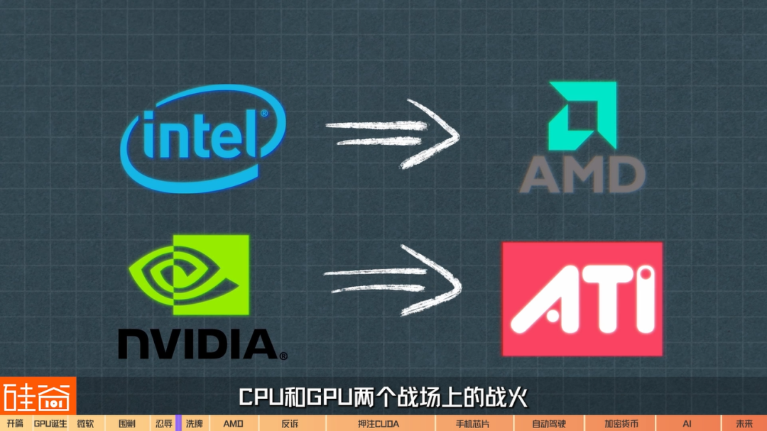 再来看如今英伟达的最大对手之一,AMD。当时AMD还不是英伟达的竞争对手,最开始AMD是英特尔的竞争对手,主打CPU市场。