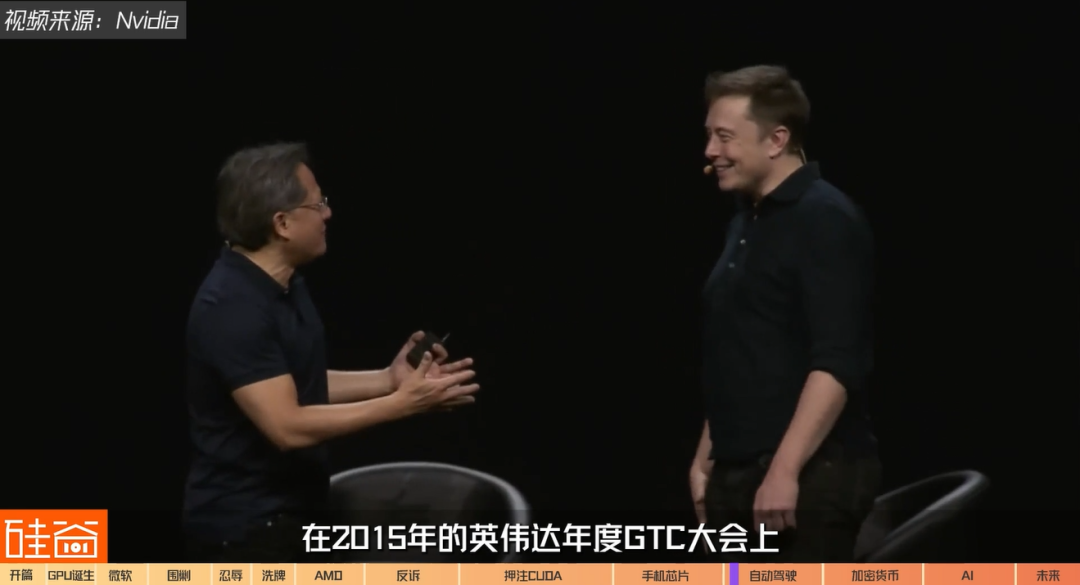 之后的几年,马斯克和老黄其实一直眉来眼去,保持着非常好的关系。在2015年的英伟达年度GTC大会上,黄仁勋还把马斯克请到了现场做嘉宾。