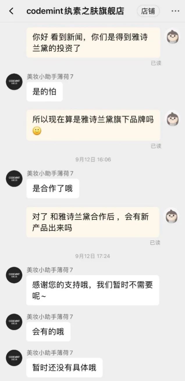 9月初,国产美妆品牌codemint纨素之肤宣布获得雅诗兰黛集团早期投资和孵化风险投资公司New Incubation Ventures的少数股权融资,这是雅诗兰黛第一次投资国产美妆品牌。