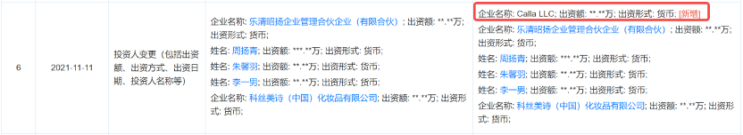 天眼查显示,截至9月28日,纨素之肤母公司杭州减法美学科技有限公司2023年以来并没有发生股权变更。而早在2021年11月,公司发生一起外资公司入股的股权变更,新增一家企业名称标识为Calla LLC的外资股东。
