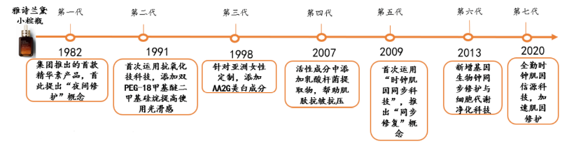 以其核心大单品雅诗兰黛小棕瓶精华为例,早在1982年,雅诗兰黛首次提出夜间修护的理念,推出首款即时修护特润精华露(小棕瓶),时至今日,已更新至第7代。