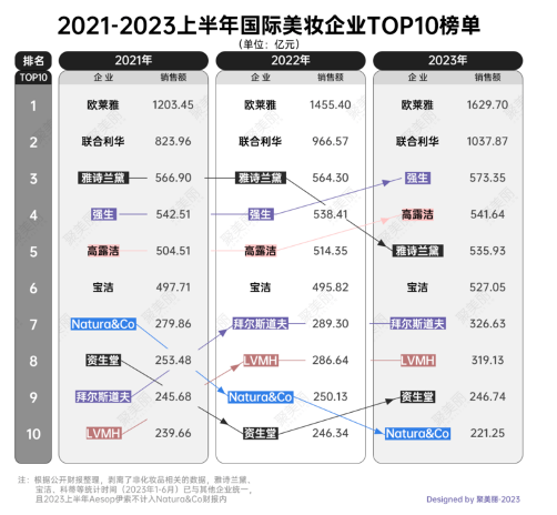 据聚美丽报道,从2021年-2023年上半年国际美妆企业化妆品业务来看,雅诗兰黛已经从2021年的第三名,跌至2023年的第五名。