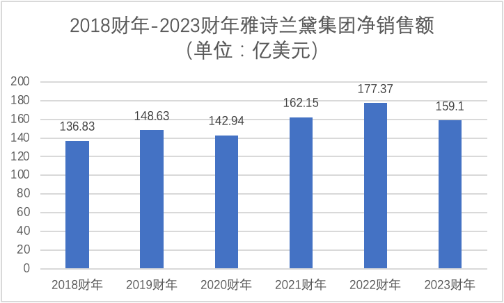 将时间拉长来看,2018财年-2023财年,雅诗兰黛集团净销售额从136.83亿美元增长至159.1亿美元,长达6年的时间仅仅增长了16.28%。