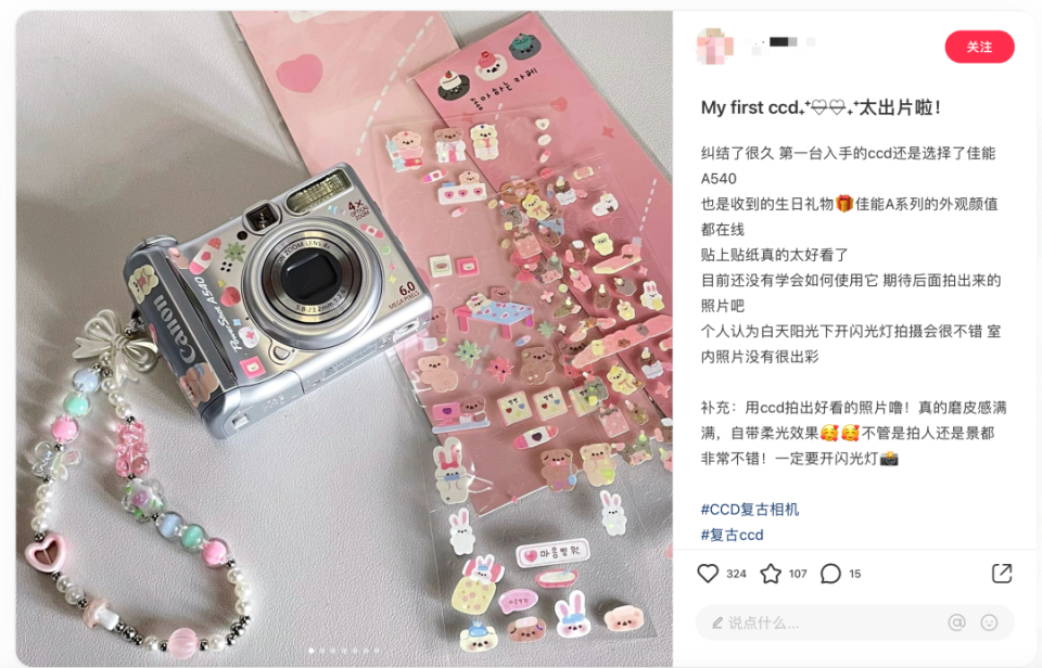 除了明星的助推,博主们的安利更是让CCD现象成为社交平台上的流行趋势。不少博主也开始推荐各种CCD相机,并以非常有氛围的出片,增强了这一二手产品的魅力,例如@周小仙yoo就在自用相机中分享了CCD。很多博主也会做测评的相关内容,例如@刘虞佳测评分享了多台CCD相机,并且其在vlog视频中也出现过去二手市场淘CCD的内容。