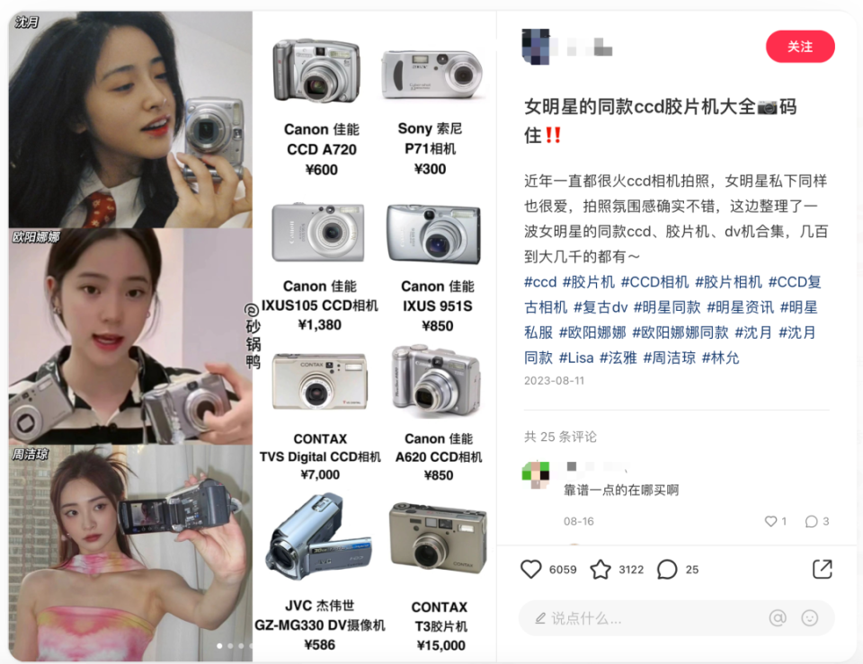 明星、博主们的分享,让其瞬间从“代替品”、“电子垃圾”成为社交平台的“顶流”。欧阳娜娜就在vlog中分享过自己喜欢的CCD相机,并且也会晒出CCD的拍摄成片,同款佳能A620也成为热门机型,价格涨至千元左右。沈月也在小红书分享过自己常用的拍照设备,其中就有CCD相机佳能IXUS 95IS,而且作为本身喜欢摄影、经常分享作品的艺人,沈月的推荐也让佳能IXUS系列的身价上涨。