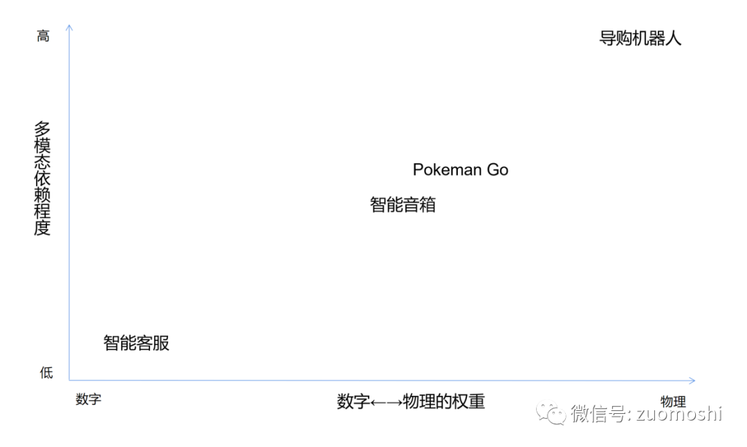 递进次序是纯粹数字空间,数字和物理空间融合,硬件产品,机电类产品,另一个轴是智能的多模态程度,如:单一维度的通用智能和多模态的通用智能,那产品分布会是: