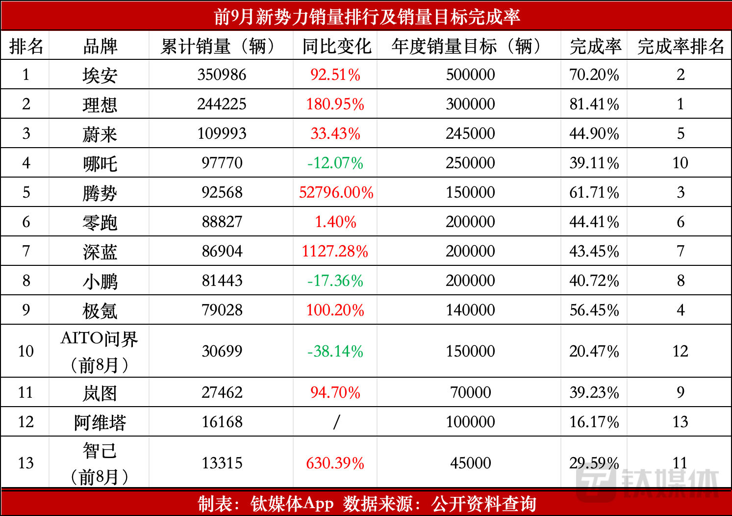 根据钛媒体App的统计,截止9月底,完成年度目标超过50%的新势力只有4家,分别是理想的81.41%、埃安的70.2%、腾势的61.71%,以及极氪的56.45%。