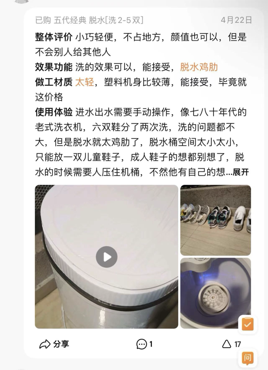 另一个拔草产品是洗鞋机。去年突然爆火的洗鞋机,其高峰时期的同比销量涨幅超过700%。网友小哲在线上短视频安利下入手一台500元以内的洗鞋机,但是入手之后发现,这个价位的洗鞋机容量小,一次最多只能洗1~2双鞋,且不支持自动注水和排水,洗完鞋子留下的泥沙等污渍还得清理出机器。洗鞋的过程也相对粗暴,对鞋子的类型限制很多,娇贵的高档鞋子根本不敢放进去。只用了一次,小哲就把洗鞋机挂上闲鱼上计划转手,但99新的品相砍半价也鲜有人询问。