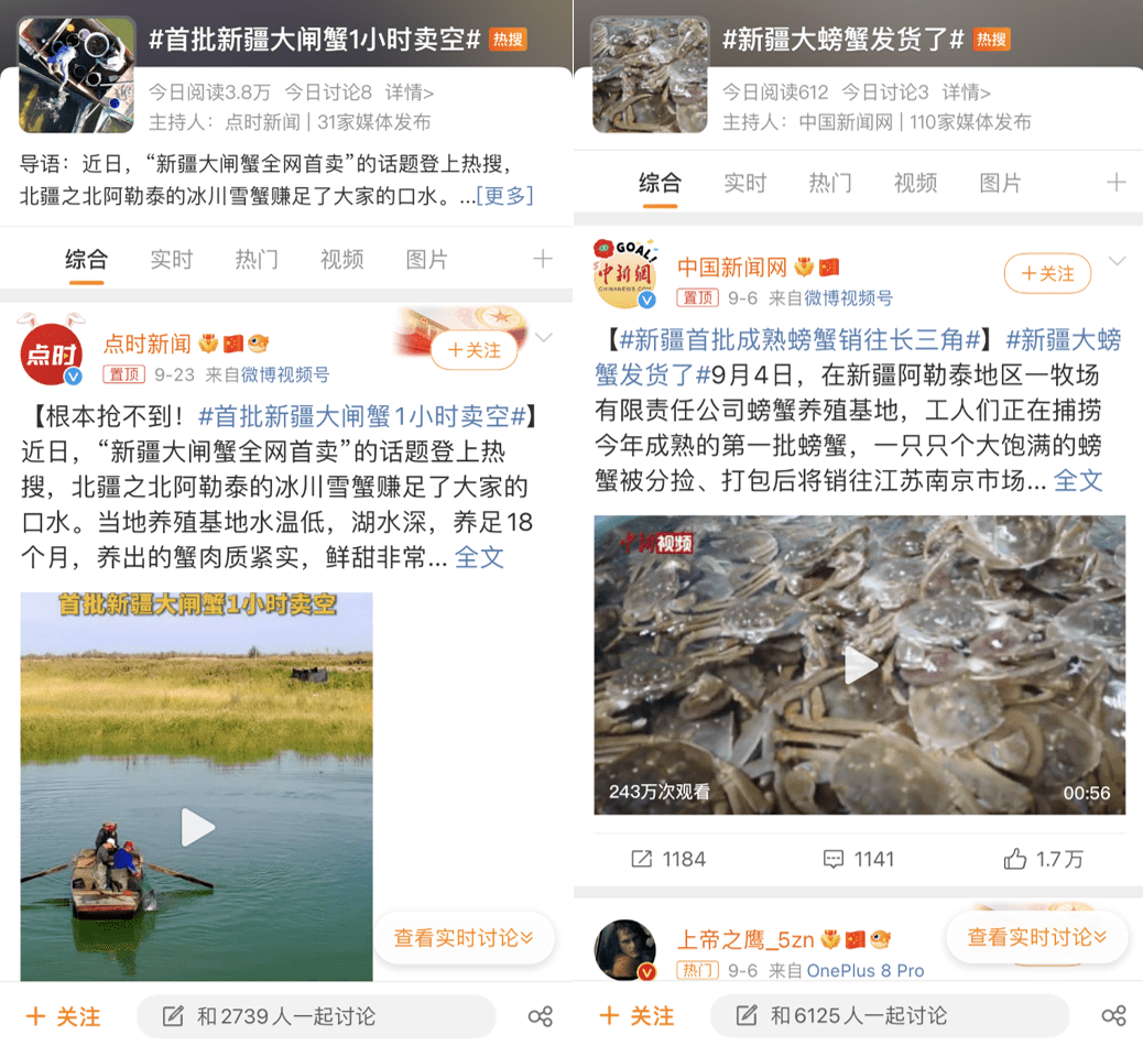 9月上旬,一则#新疆大螃蟹发货了# 的微博热搜曾引发网友围观。据中新社,新疆阿勒泰地区,今年的第一批螃蟹被打捞上岸,送往浙江、上海等地,比阳澄湖等内地产区还要早上10天左右。