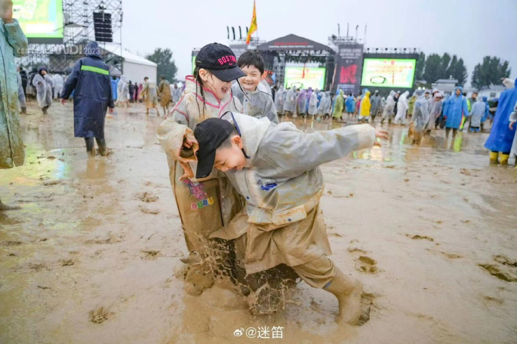 在“盗窃门”发生的数日前,迷笛音乐节就成了国庆音乐节的焦点。大雨天里,乐迷们随着音乐节奏在泥巴里打滚的视频,将“泥笛”送上热门词条。残障人士董宇的轮椅被台下乐迷托举起来观看演出,由这些名场面构成的热门视频及图片,在互联网疯传。