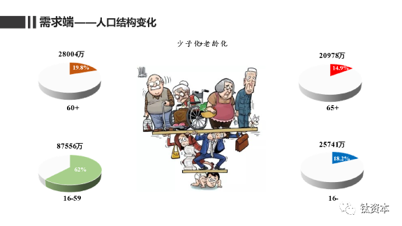 通过人口结构,我们能看出未来需求的人群分布。首先是2.8亿60岁以上的老人,这些人充分享受到了改革开放的红利,因为计划生育,他们普遍只有一个子女。他们的生活节奏变化非常快,因为经历过较大的收入起伏。这些人具有消费能力,同时也有各种需求,特别是由于子女较少,健康问题相对较多。从需求端来看,人口结构的变化为我们提供了重要启示。未来中国医疗大健康的需求是可持续且旺盛的。
