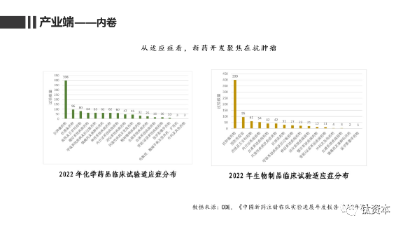 关于产业内卷,其实内卷不仅在中国的医疗行业存在,也存在于其他行业。下图是一些数据,引用了CDE最近发布的中国新药注册临床实验进展年度报告。从适应症可以看到,无论是化药还是生物药,在临床适应症的选择上都存在拥挤的现象,特别是在肿瘤领域。
