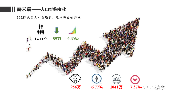 具体来说,需求方面十分强劲。我们需要特别关注中国的人口结构,因为这对医疗需求具有显著影响。在2022年,中国人口出现了负增长,这是历史性的拐点。总体人口为14.1亿,减少了85万。新增出生人口为956万,而死亡人口为1041万,当然,疫情也对这些数据产生了影响。因此,我们的人口正在下滑。