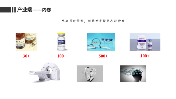 比如,PD-1药物领域,中国有30多家企业,ADC(抗体药物-药物复合物)领域有100多家,而核酸药物领域相对较新,也已有100多家企业,更令人担忧的是,医疗器械行业也存在相似情况。比如,在CT领域,全球市场虽然庞大,但实际上被几家公司垄断,而国内就有20家企业。手术机器人领域也是如此,尤其在骨科领域,总共可能有100家企业。