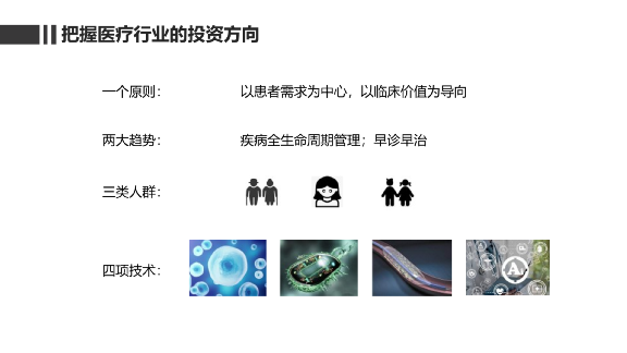 在这样的时代,我们该如何把握整个医疗行业的投资方向?这里既有机会也有风险。从19年基金设立时提出的一个原则,到疫情这三年,我们不断积累总结了两个趋势、三类人群和四项技术。