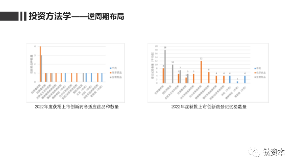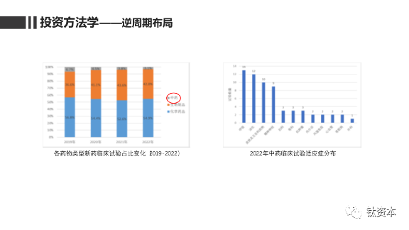 第一个是逆周期的布局。这是一种非从众的投资方法。以临床试验数据为例来解释。在新药投资方面,去年统计各类药物的临床试验占比发生了变化。中药的临床试验占比始终非常小。另外中药的适应症,主要聚焦在呼吸系统上。呼吸系统的疾病可能比不上肿瘤。呼吸系统符合两个趋势中的一个,也符合疾病全生命周期管理的趋势。