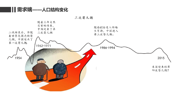 为什么要谈论人口问题?因为医疗需求的本质源自于人。只有深入研究人口问题,我们才能找到医疗需求的根源。我展示了一个简单的人口增长曲线图,我们可以看到中国经历了三次婴儿潮。第一波婴儿潮发生在1954年,二战结束后世界范围内都出现了婴儿潮。在1962年到1971年,自然灾害结束后,我们迎来了第二波婴儿潮。接着在1986年到1994年这段时间,60后,也就是第二波婴儿潮的人开始结婚生育,进入了中国的第三波婴儿潮。实际上,2015年应该迎来第四波婴儿潮,也就是说,90后理论上应该开始生育,事实上似乎并非如此。