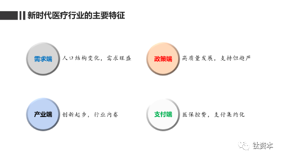 关于新时代下的医疗行业特征,我认为可以从四个方面总结。第一,需求端呈现旺盛态势。第二,政策方面得到充分支持。第三,产业方面存在明显内卷现象。第四,在支付方面,突出的主题是费用控制。