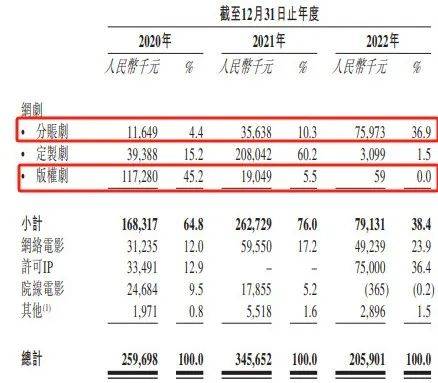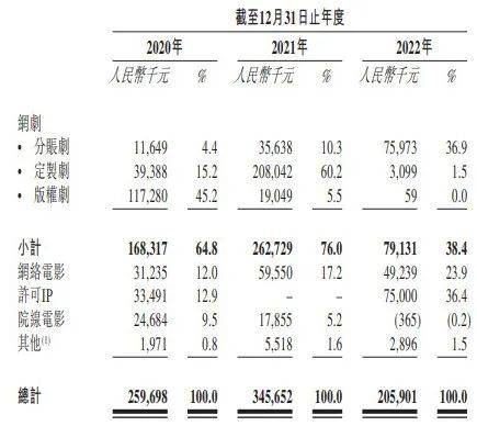 定制剧从2021年的2.08亿元下滑至2022年的309.9万元,版权剧收入从2020年的1.17亿元下降至2022年的5.9万元。