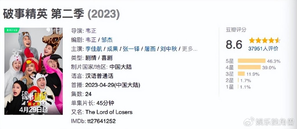 爱奇艺则在此前打出了小逗剧场的标签,先后亮相了《瓦舍江湖》《医是医二是二》《破事精英》等喜剧作品。其中《破事精英》由《爱情公寓》导演韦正执导,豆瓣评分7.8分,算是去年喜剧市场的惊喜之作。到今年第二部来袭,更是直接斩获了豆瓣8.6分的高分。