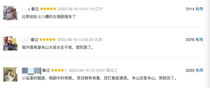 在它们身上另一重共性应该是对年轻人喜剧偏好的“深入研究”。《鹊刀门传奇》的导演吴迪系武术冠军出身,也正是他带来了剧中动作戏的升级,这也是该剧好评体系中的重要加分项;除此之外,据资料显示,他还与另一位导演唐铁军研究了短视频时代的观众爽点。