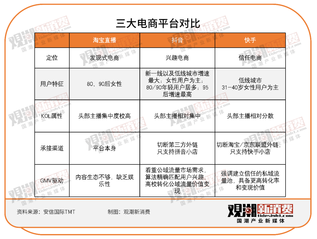 在直播大战中,典型平台有抖音、快手、点淘等,三大直播电商平台分别致力于打造“兴趣电商”“信任电商”和“发现式电商”。