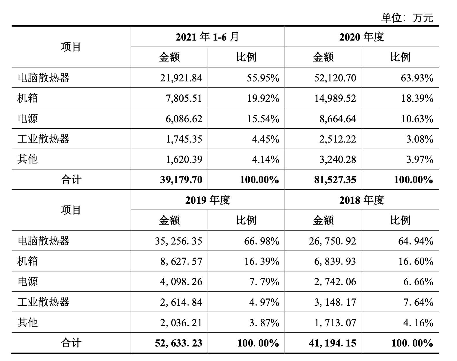 九州风神上会稿显示,公司电脑散热器产品占主营业务收入比例约在60%左右,是公司收入来源最大的产品类别;而来自工业散热器的营收占比较小,约在5%左右。