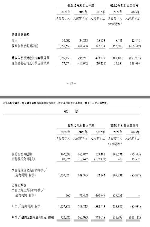 招股书显示,2020-2022年,天图投资持续经营业务收入分别为3860.2万、3482.3万、4598.3万元;总收入及投资收益分别为11.95亿、4.95亿、4.23亿元;持续经营业务期内利润分别为10.58亿、6.49亿、5216.4万元。
