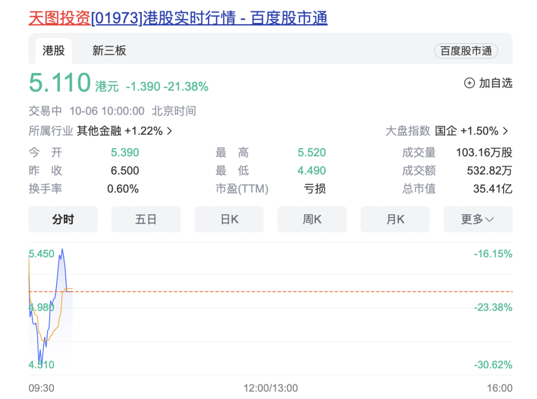 截至发稿,天图投资股价已V型反弹至开盘价附近,最高达5.52港元。